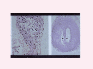 近几年来对炎症在动脉粥样血栓形成病因中起重要作用的认识逐渐增多。这张幻灯片展示了一个动脉粥样硬化病灶,图片下部病灶侧翼区有一块膨大。大量炎症巨噬细胞可能在病灶易破裂性和急性沉淀中起了作用。在动脉粥样硬化病灶中找到微生物如衣原体和关于应用抗衣原体抗生素的干涉研究的前瞻性发现在我脑海中导致了困惑,就是倾向于将病灶中的炎症和感染同等看待,及将它们都与动脉粥样硬化的慢性发展联系起来。