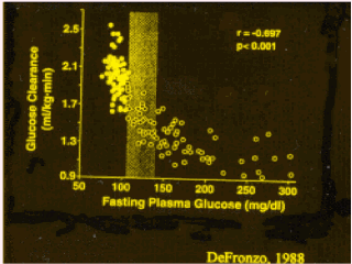 让我们谈论一下在有糖尿病和葡萄糖不耐受的人群中动脉粥样硬化血栓发作风险的预报物。有关糖尿病课题中心血管疾病的高风险,在降低的葡萄糖耐受和降低的空腹葡萄糖(更轻的程度上)的人群中也存在。这些情况的共同点是一种对胰岛素作用有抵抗的综合征。胰岛素敏感性在2型糖尿病人和葡萄糖不耐受人群中普遍存在。但在很多维持正常葡萄糖耐受的胰岛素抗性课题中,即使在对葡萄糖耐受正常的人群中对胰岛素作用仍有很广的敏感性范围。