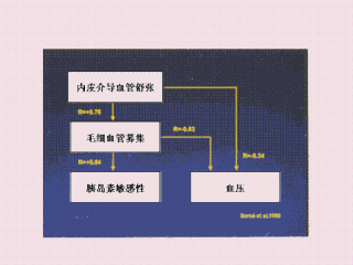 这张图展示了血压和胰岛素抵抗间的关系。你可看到任何存在于胰岛素抵抗和血压间的关系似乎都可用毛细血管结构和功能上的异常来解释。脉管发生缺陷和对乙酰胆碱血管舒张作用的低敏感性可能导致低毛细血管密度,而低毛细血管密度与高血压和胰岛素抵抗都相关。