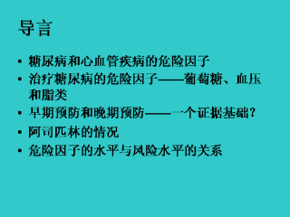 现在我来介绍一下这篇讲稿的主题。首先我们来考虑一下关于危险因子和糖尿病患者的心血管风险的概念。我将讨论对葡萄糖降低的干涉、对血压的干涉和对脂类处理的干涉在预防糖尿病患者的心血管疾病方面的证据,以及对糖尿病患者的早期预防和晚期预防,并考察哪些证据可以作为处理的基础。我将特别的讨论一下使用阿司匹林的疗法。结束时我将建议,在决定是否要对这些病人采取或更换一种疗法时,我们应该关注绝对风险的水平而不是危险因子的水平。