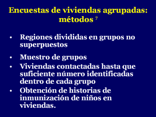 Encuestas de viviendas agrupadas son un método común de medir la cobertura de inmunización y son usadas frecuentemente en países en desarrollo. Regiones son divididas en grupos no sobrepuestos o sub-poblaciones y estos grupos son muestreados con probabilidad proporcional a su tamaño. Son contactadas las viviendas hasta que el número suficiente sean identificadas dentro de cada grupo.