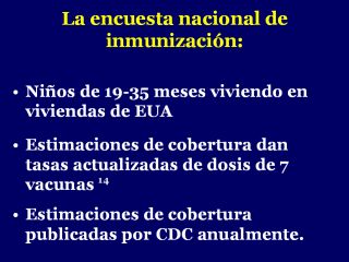| La encuesta nacional de inmunización (NIS), implementada por el Programa Nacional de Inmunización del CDC y por el Centro Nacional de Estadísticas en Salud en 1994, ha sido descrito como la “columna vertebral del sistema de evaluación de inmunización”.13 La población objetivo del NIS son niños de 19-35 meses de edad viviendo en viviendas en EUA (no institucionalizadas). Las estimaciones de la cobertura ofrecen tasas de cobertura actual para siete vacunas y son publicadas anualmente por el CDC. |