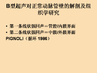 目前带有8M赫兹以上探头的超声仪器都可以进行动脉管壁的测量。壁近端及远端是两条线状强回声,中间隔以低回声带。近端的线状回声由管腔与内膜的界面产生,远端线状回声由中膜和外膜的界面产生。