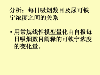 我们已在妇女中研究了每日吸烟数目及尿可铁宁浓度之间的关系。我们将这个分析局限于自报的主动吸烟者以最小化主动吸烟者假报戒烟造成的误差。我们一开始使用未经处理的粗数据来生成一个每日吸烟数目及尿可铁宁浓度之间相应评估的