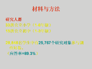 数据收集自1998年2月2日至17日的日本Torkorozawa33所公立小学的1-6年级学生和15所初中的1-3年级学生。28,848名学生中共有25,767个对象参与调查问卷。应答率是89.3%。父母参加的知情同意以书面形式获得。
