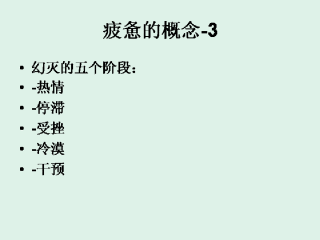 这个过程描述为出现在幻灭的五个阶段的一系列累积的理想,精力,目标的丧失。第一阶段热情出现在新工作开始时。这时从业者干劲十足并有着不合实际的期望。停滞出现在从业者虽然仍在做着工作,却已逐渐与其脱离的时候。第三阶段受挫出现在从业者开始质疑自己的效力和工作价值时。冷漠被用来保护不被受挫伤害。干预可以出现在任何阶段来阻止预防和治疗疲惫。
