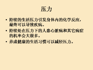 每天生活中的一些压力,比如出发晚了或是遇上了交通阻塞,可以带来严重的健康后果。因为这些事件每天都会发生,一次又一次的压力引起的身体内反应可以给健康带来严重的影响。遇到压力的时候,大脑发出信号引起全身体的应激激素的释放。研究者正在探索这些产生肾上腺素的物质的持续释放对身体的作用。众所周知,高压力的生活可以提高患心脏病的机率。现在专家们认为它可能影响记忆甚至引起大脑萎缩。