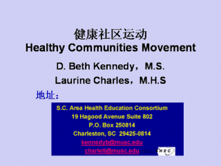 D. Beth Kennedy,理学硕士,是南卡罗来纳地区健康教育协会的教育主管,美国南卡罗来纳医科大学健康专业学院副教授。她在南卡医科大学获得生物统计学硕士学位,并在那儿从事评估、教育和管理工作长达21年。1995年,Kennedy夫人接受了五个月的关于健康社区建设的培训,该培训计划由Tyler Norris推动。她也参加了健康促进研究会(the Institute for Healthcare