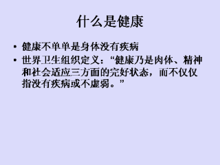 今天,公共卫生和保健聚焦在健康的广义定义。健康不单单是身体上没有疾病,而是身体、精神和心理全面的健康状态。而社区健康,也是指物理环境、社会气氛、人力财力资源以及宗教支持系统的健康。