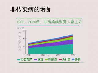 在发展中国家,非传染病致死的比率由47%升至70%,这种全球范围内的非传染病的迅猛增加是由人口老化驱使的,老化现在正被发展中国家中大批人口吸烟所放大,而不久并将有更多这种情况发生。