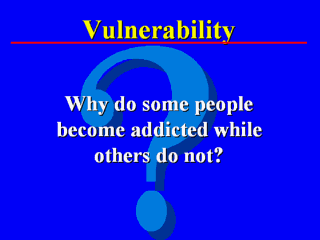 | What factors suggest vulnerability to drug abuse and addiction? Vulnerability is a product of the interaction of a person’s genes, environment, and developmental age. These interactions are complex and difficult to tease apart. |