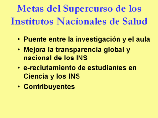 | Estas metas serán alcanzadas al compartir conferencias de los INS con las aulas del mundo, permitiéndoles ver los trabajos dentro de los INS a través de sus conferencias, reclutaremos los mejores estudiantes para los INS y para la ciencia. Finalmente los contribuyentes serán capaces de observar las conferencias para ver que están desarrollando los científicos de los INS. |
