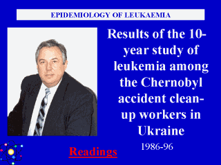 medical institutions of Nikolaev region (Ukraine). In 1986 – 1988 worked at the Ministry of Health Care of Ukraine where was responsible for rehabilitation program of the population of Chernobyl contaminated area. Since 1988 heads scientific leukemia epidemiology laboratory of the Radiation Medicine Scientific Center. In 1995 – 2000 headed the Medical Department of the Ministry of Atomic Energy. Since 27 April 1986 was involved in clean-up works in the Chernobyl area. One of the leading specialists in the problems of automatic systems of long-term medical monitoring of people damaged in result of Chernobyl accident (State Registry of Ukraine). Author of more than 100 scientific articles and works on the problems of epidemiology, automatic systems of registration and radiation medicine. Prominent participant of international epidemiology projects: AIFIKA, Chernobyl, Leukemia. |