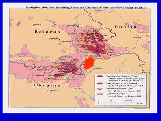 contamination deposition levels of Cs-137 around of Chernobyl. The greatest radiation accident took place in Chernobyl Nuclear Power Plant(near Pripjat, Ukraine) on April 26, 1986. In clean-up works participated more than 600 000 people, among which 200 000 constituted Ukrainians. The works were carried out up to 1990. Radioactive contamination spread on the territory of Ukraine, Belorus and Russia. The density of contamination is shown on the map to the left. |