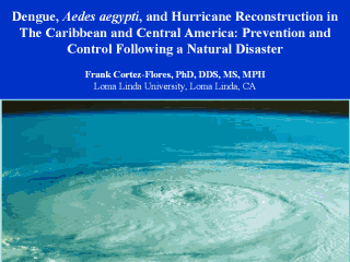 LEARNING OBJECTIVES Upon completion of these presentations, the learner should be able to: · Examine and explain the growing significance of disaster mitigation and strengthening regional surveillance networks for dengue and dengue hemorrhagic fever following a natural disaster (e.g., hurricane). · Define how to strengthen the regional capacity for effective implementation of prevention and control strategies for disaster mitigation. · Emphasizes the practical application of field research in the management and control of the dengue vector, Aedes aegypti, following a natural disaster as well as promoting the further development of applied research in the areas of rapid diagnosis, epidemiology, and prevention. · Describe an interdisciplinary team approach to achieving success with prevention and control programs. Emphasizing national and regional infrastructures for early warning of and rapid response to infectious disease threats, following natural disasters, through laboratory enhancement.