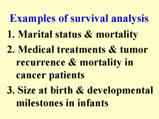 May 1997 when the mortality dataset was last updated. (Cheung, Int J Epidemiol 2000; 29:93-99) Example 2 is a clinical trial of medical treatment regimes in breast cancer patients in Germany started in 1984. The primary endpoints were time from mastectomy to tumor recurrence and to death. Censored at mid 1997 when the data was analysed. (Sauerbrei et al. J Clin Oncol 2000; 18:94-101) Example 3 is a paediatric study of Pakistani infants. The primary concern was age at achievement of developmental milestones in relation to size at birth. Data censored at 24 months of age when the follow-up for each newborn was ceased. (Cheung, Yip, Karlberg. Int J Epidemiol 2001;30:66-74) |