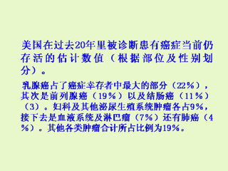 不同性别中各组成比例为,超过2/3(69%)的女性癌症幸存者曾患乳癌(41%),妇科肿瘤(17%)或结肠癌(11%)。对于男性癌症幸存者,2/3(66%)曾患有前列腺癌(39%),其他泌尿生殖肿瘤(如睾丸癌或肾癌)(14%)或者结肠癌(13%)。(这些比例是建立在肿瘤登记系统按照1998.1美国人口普查评估得出的原位癌或原发病例存活者为740万人的基础上的)。