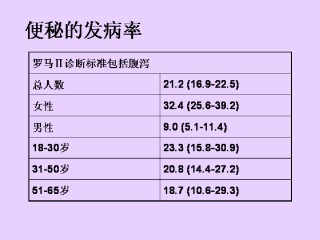 Ⅱ诊断标准统计的便秘的发病率,其中包括解稀便和水样便。