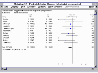 individual incluido en el meta-análisis. Mostrando los menús pueden cambiar escalas, estadístico mostrado (Razón de Momios o Riesgo relativo), etc. |