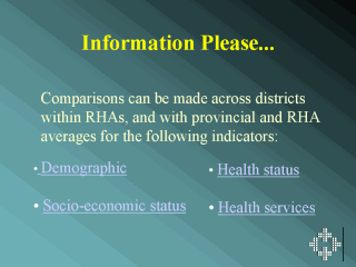 information are most relevant to local planners? Through ongoing collaboration with Manitoba Health, planners, decision-makers, and medical officers from the various RHAs in Manitoba, researchers have been able to identify and provide the data needed by the RHAs in decision-making. POPULIS is used to generate profile data for individual RHAs, which can then be used to show how the regions’ health, socioeconomic risk, and health care use characteristics differ. Data for four general categories of measures have been especially useful: demographic, socio-economic, health status, and health services. |