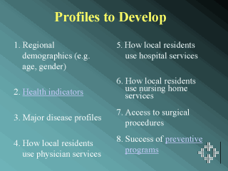 regions.4 Once such profiles are developed, comparisons can be made across different regions and to provincial/state averages. As part of a recent deliverable, MCHP has made available via the Internet, profile data for each RHA in Manitoba. These data highlight summary information of key indicators. The following slide uses two graphs from these profiles to show how the data can be used to determine if the population’s health needs are being met. Planners must be trained to use such data effectively; training issues will be discussed later. |