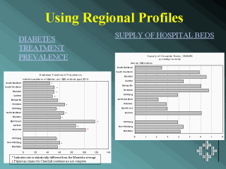 of hospital beds. The regions are ordered from ‘most healthy population’ to ‘least healthy population’, as measured by their premature mortality rates. Diabetes treatment prevalence rates increase as the overall health of the regions’ populations decrease. However, hospital bed supply (one indicator of service provision) does not appear to correspond to a pattern reflecting need. Given such information, planners may consider the following: 1. Is there a relationship between the overall healthiness of the population and the corresponding health care service utilization (e.g. physician visit rates, hospital separation rates, hospital bed supply, and consult rates)? 2. If not, what could/should be changed? Also see: Winnipeg Hospital Bed Closures: Problem or Progress? (powerpoint presentation) |