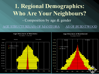 service needs often vary according to these two characteristics. So, compared to other regions, how many people are likely to enter the door of the various types of health services? The “population pyramid” summarizes this information in one picture. E.G. In the pyramid above, the majority of the residents of the Burntwood RHA are younger (13% are 0 - 4 yrs old); 24% are females between ages 15 and 44. These percentages are similar to Manitoba overall, where 11% are between 0 and 4 yrs, and 22% are females between ages 15 and 44. However, in Manitoba, the distribution is less ‘triangular’, with the majority of residents between 30 and 39 years. Questions for Planners 1. How does the RHA’s population pyramid compare to the province? To other regions? 2. How will pyramid affect the types of service delivery? (Younger population may indicate younger families requiring prenatal care, maternity & pediatric services & immunization programs) 3. How many people could possibly require health services? |