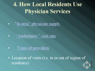 met. Use of physician services varies according to several characteristics including: - Demographics - age, gender, socioeconomic status (people who are older, female, or poor have more physician visits than others) - Physician supply - availability and accessibility(do residents tend to visit physicians located in a different region? If so, why?); type of physicians (generalist or specialist) - Health status (people in poor health need more physician visits) Questions For Planners: 1. Does the physician visit rate make sense given the healthiness of the region’s residents or does it reflect “under- or over- servicing”? 2. Are there sub-regions within the region with high need populations and do they have good access to physician services? 3. Should any patterns of usage of “within RHA” or “outside RHA” GP/FPs and specialists be altered? |