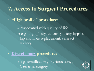 potential overuse. Depending on a region’s demographic composition and its proximity to a major/urban hospital, providing access to surgical procedures may be an issue. Local rates should be compared to regions of similar size or composition, regions that are nearby, and to provincial/state rates. Planners should address questions such as: 1. How do the procedures rates compare across regions? 2. Are differences related to the proximity of a major health centre? 3. Are rates related to local health status and need? 4. If rates for a procedure appear too low, do local physicians have good referral links to relevant surgeons? Can these links be improved? 5. What are the trends over the past five years? Three years? One year? |