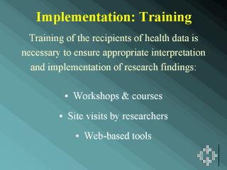 also be held on site in each of the RHAs. Alberta Heritage Foundation for Medical Research (AHFMR)’s SEARCH program seeks to equip RHA personnel to "identify and use appropriately timed information for managing the health system and to participate in health research activities relevant to local needs." Their training extends over a six-week period. 2. Site visits - on-site meetings between Centre researchers and RHA personnel provide researchers with a first-hand view of the specific RHA and helps them understand the context in which the various decision-makers work. 3. Web tools - MCHP’s Concept Dictionary provides technical support for programmers and researchers using data from the Centre. Future projects seek to follow this model to develop a tool even more relevant to the needs of RHA-based health researchers. |