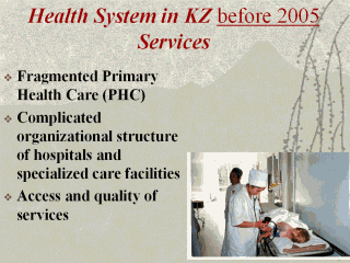 | PHC duplication of services Those who referred to PHC – 20% were redirected to other clinics, 70.6% were referred to hospitals. While PHC by nature should address 90% of admitted cases!!! PHC – poor organizational identity impeding formulation of concrete package of services, disabling integration and prophylactic measures at municipal level. Hospitals – duplication of services, inefficient distribution of resources To date the allocation of resources from local budgets to inpatient care within the guaranteed benefits package has exceeded PHC expenditures by three times, while the health care delivery system remains predominantly inpatient-based. As a result of excessive hospital admissions, the number of hospital beds along with the average length of hospital stay has been increasing consistently since 2000. The main reason of why people prefer hospital treatment to outpatient care is the lack of drug provision at out-patient level and the insufficient quality of services provided at primary level. Inpatient care has not been standardized so far (with the exception of republican health facilities), with the quality assessment system being inadequate The current health care quality assurance system faces a number of problems. Administrative measures do not motivate the staff and managers to improve their performance; proposals aimed at addressing problems in provision of health care are seen as recommendations and are not often followed; there is a lack of linkage between internal and external quality assurance. In addition, health facilities related to different agencies, as well as state institutions and health facilities that are not contracted for procurement of health services fall out of the system. |
