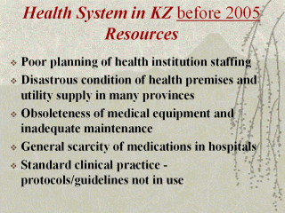 specialists Drugs – forcing patients absorb expenses for drugs It is worth noting that the increase in financing over the period from 2002-2003 did not yield the desired result, except for the annual increase of 5-7% in the number of patients treated in hospitals. Despite repeated increases in wages of medical staff (by 20% in 2004 alone), the official average salary in the sector is half of the national average. There is still a problem related to the fact that the obligations assumed by the state to ensure guaranteed benefits package to the population are inadequately funded. Paid health care services take the place of free medical care. Due to the lack of clear distinction between the guaranteed benefits package and health care services provided for a fee, the level of informal payments remains high to the advantage of health workers. The recording of health services provided within the guaranteed benefits program is not properly established, thus promoting the growth of shadow economy. There is no comprehensive sector policy of resource saving. The distinction between purchasers and providers of health services exists only as a formality, as almost all providers are state institutions, administratively and economically reporting to government health authorities. Health care development is not a priority of regional social and economic policy. Therefore a number of general negative trends could be identified requiring corresponding management decisions. First, the most important principle of organization of the health care system – continuity of health care provision throughout the system— does not exist as it should. Second, inequity is observed in quantity and quality of services provided as well as in basic indicators of health care development across different areas within the same province. Third, the mandatory components of the HCS management system, including monitoring and evaluation of performance of health facilities and the health system as a whole are not well developed. Lack of coordinated policy in information support of the health system results in reduction of accuracy of information collected in the sector, late submission of information from sites to province and central level, impossibility of comparing the data collected by different sub-systems. This eventually results in reduction of efficiency of decisions taken on this basis and irrational use of resources allocated for health system. Fourth, lack of uniform approaches and standards in medical equipment and medicines procurement results in more expensive equipment and medical goods procured as well as problems with the quality of procured goods. Fifth, lack of coordination of operations of health management bodies with other public authorities directly or indirectly influencing the level of public health (labor and social protection bodies, culture bodies etc.) is observed. This coordination is an important instrument for formulation of a healthy lifestyle and, eventually, it reduces the need in health care. Sixth, PHC being the central part of the health system should carry out the main function of qualitative improvement of the population health indicators. The efficiency and quality of performance of the entire health system, retention of national labour force capacity and solution of most medical and social problems arising at the level of the family and socially unprotected population groups: children, invalids and aged people depends on its condition. PHC doctor now carries out the dispatcher functions: the frequency of referring out-patients to specialized doctors is extremely high. Seventh, a major misbalance is observed in the volume of funding of out-patient and polyclinics and in-patient care in favor of the latter. This hampers implementation of modern resource saving methods in provision of health care at pre- and post-hospital stages. This results in wider indications for referral for in-patient treatment, annual growth in numbers of hospital beds and, consequently, in more expensive health care. Eighth, the state health system is not physically separated from the private one: some state-run health organizations occupy the same buildings as private ones, providing chargeable health care services. Ninth, lack of properly trained qualified managers in the sector has resulted insufficient management and inefficient use of resources. The manager of a medical facility acts as a manager, administrator, chief doctor, assistant manager, clinician and so on. Tenth, the health care system activities in current conditions cannot be limited to addressing purely sectoral problems. The comprehensive character of health of the population requires strengthening intersectoral coordination efforts, particularly in the area of health promotion and improvement of social, psychological and ecological environment. In addition, the population is not well- informed and doesn’t take an active part in the health care system. In this respect, it is necessary to choose a clear, publicly understandable, manageable and efficient model for the health delivery system. |