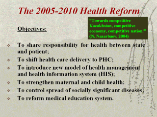 of financial resources and mandatory decentralization of procurement. The Program sets out a package of required economic, social, organizational and other measures directed toward the development of accessible, quality, socially oriented and efficient health care system of the Republic of Kazakhstan. Solidarity-based joint responsibility of the state and the population for health; 2. Reform and development of the health care delivery system; PHC reform creating a foundation for the efficient health care system; Development of rural health care; Ensuring sanitary and epidemiological well-being; Health promotion and prevention of diseases; Inter-sectoral approach to health protection of the population; 3. Improvement of the health management system: Rational delineation of functions and authority; Improvement of the health care services quality management system; Development of competition within the health care system; Major approaches to improving the health finance system; Increase efficiency of state regulations in relation to drug circulation; An integral health information system; 4. Protection of maternal and child health; 5. Improvement of prevention, diagnostics, treatment and rehabilitation of diseases that take a large toll on society; development of medical research and science; 6. Training and retraining of health staff. The reform was an absolute need under present circumstances, objectives seem to be slightly over-ambitious esp. in relationship to timing and capacity of Health sector staff. MoH could have been referring to various consulting groups to help re-engineer the system, unfortunately it is not a practice. |