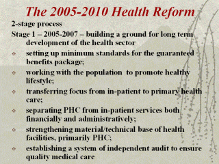 | Stage 1 dividing up joint responsibility of the state and population for health; - setting up minimum standards for the guaranteed benefits package; - working with the population to promote healthy lifestyle; - transferring focus from in-patient to primary health care; - separating PHC from in-patient services both financially and administratively; - strengthening material/ technical base of health facilities, primarily PHC; - rationalizing in-patient and emergency care services; - implementing of actions to strengthen maternal and child health; - strengthening preventive, diagnostic and treatment and rehabilitation measures related to diseases which take a large toll on society; - establishing a system of independent medical audit to allow for the provision of quality of health care services; - introducing economic relationships between health facilities; - training health managers and improving of health resource management; - improving quality of training and retraining systems for medical and pharmaceutical staff to meet the needs of the new PHC system; - improving the legal and regulatory framework for the health system; - taking action to bring the system up to international health standards; - developing and implementing modern information technologies. |