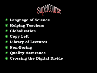 | The Supercourse is very different than any other form of learning. It is Internet Learning, and consists of 11 different components each one of which have rarely been used. All 11 components have never been used together, until now. This combination serves as a very powerful tool, for the manufacture, distribution and utilization of lectures. |