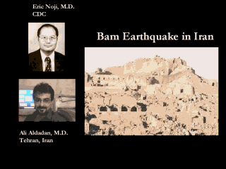 | In Dec. 2003 Iran was rocked by a huge early quake. We got one of the word’s leaders, Eric Noji, M.D. from CDC to produce a lecture on the Bam Earthquake. In addition, a person who was on the ground Ali Aldadan, a Ph.D. student in epidemiology produced a second JIT lecture on the unfolding events. Ali taught the students in Pittsburgh with PowerPoint presented here, and him teaching over the telephone. The results of this was published in the Lancet. |