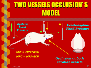 The other variant is illustrated used with the pattern of occlusion of both carotids combined with an increase of the Pressure of the Cerebrospinal Fluid, with a consequent decrease of the Arterial Pressure. CSF= Cerebral Sanguine Flow MCP= Middle Cerebral Pressure VCR= Venous Cerebral Resistance MAP= Middle Arterial Pressure ICP= Intra-Craneal Pressure |