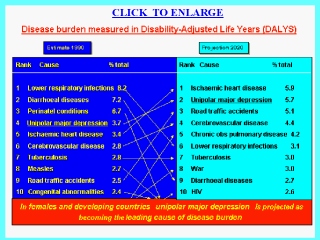 | The figure shows the projections made for the year 2020. ( Murray and Lopez, 1997 a) We note that the importance of the disorders typical for children and the poor seem to decline, and the disorders typical for older age groups incline. One reason is the expected demographic transition (life expectancy increases in many countries) that is followed by an epidemiological transition (the disease burden in total changes with increasing number of people in the various age groups). |