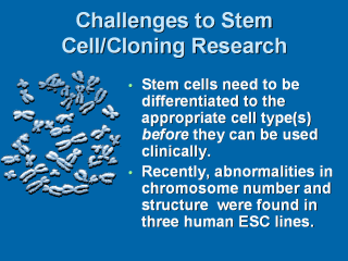 the International Society for Stem Cell Research website: "Scientists are still working on developing proper conditions to differentiate embryonic stem cells into specialized cells. As embryonic stem cells grow very fast, scientists must be very careful in fully differentiating them into specialized cells. Otherwise, any remaining embryonic stem cells can grow uncontrolled and form tumors." ¹ Recently, three established stem cell lines were shown to exhibit abnormalities in chromosome number and structure.² ³ Obviously, stem cell lines must be checked periodically to make sure the cells do not become abnormal during continued culture. The use of abnormal cells in treatment of patients could result in indeterminate complications. References ¹ "Frequently Asked Questions." International Society for Stem Cell Research. ² Draper, J.S., et al., "Recurrent gain of chromosomes 17q and 12 in cultured human embryonic stem cells," Nature Biotechnology December 7, 2003, advance online publication. ³ C. Cowan et al. 2004. Derivation of Embryonic Stem-Cell Lines from Human Blastocysts. New England Journal of Medicine 350: 1353-1356. |