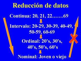 | La reducción de datos es en una dirección. Una variable reunida como continua, puede ser reducida en tamaño y cambiada a una variable con intervalos, la cual puede ser cambiada o aún reducida a una variable ordinal o a una variable nominal pero la transformación opuesta no es posible. |