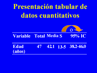 tabular como media y desviación estándar (S) o media e intervalo de