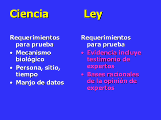 | En la ley, la carga de la prueba está basada en la evidencia que puede incluir el testimonio de expertos. El único requisito es las bases racionales de la opinión del experto. |