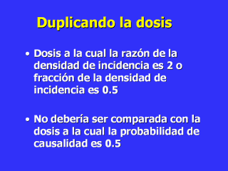 | Es tentador comparar la dosis duplicada con la dosis a la cual la probabilidad de causalidad es mayor al 50%. La duplicación de la dosis es el nivel de exposición (dosis) por la cual los expuestos están dos veces más probable que desarrollen la enfermedad que los no expuestos. |