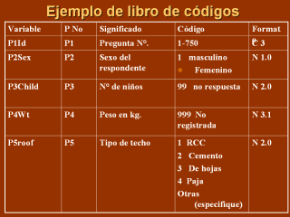 | En formateando N Numérico N1.0 significa 1 espacio de amplitud N2.1 significa 2 espacios antes del punto decimal y 1 espacio después del punto decimal (Nota: por favor vea el manual del paquete de computación para estadística y refiérase a como debe formatear los datos) C Carácter Categorías de referencia -Si conoce la categoría de referencia desde antes, asegúrese que sea el primero o el último código. Eg. La categoría de referencia del tipo de techo, es RCC, entonces codifique a RCC como 1. RCC y los otros tipos de techos pueden estar en cualquier orden Otros (especifique) no será codificado hasta tener los datos |