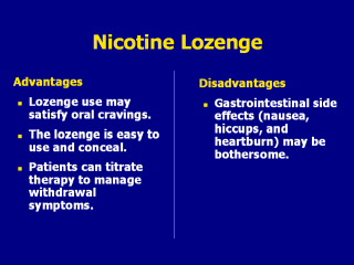 following: Lozenge use may satisfy oral cravings. The lozenge is easy to use and conceal. Patients can titrate therapy to manage withdrawal symptoms. Disadvantages of the gum include the following: Gastrointestinal side effects (nausea, hiccups, and heartburn) may be bothersome. Slide is used with permission, Rx for Change: Clinician-Assisted Tobacco Cessation. Copyright © 1999-2007 The Regents of the University of California, University of Southern California, and Western University of Health Sciences. All rights reserved. |
