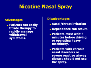 the following: The dose can be easily titrated to rapidly manage withdrawal symptoms. Disadvantages of the nasal spray include the following: The initial nasal or throat irritation can be bothersome; it may take up to 3 weeks for the patient to tolerate therapy. Dependence can result. The nicotine nasal spray has a dependence potential intermediate between tobacco products and other NRT products. About 15–20% of patients continue to use the nicotine nasal spray for longer periods than recommended (6–12 months), and 5% use the spray at higher doses than recommended (Fiore et al., 2000). Patients should wait 5 minutes before driving or operating heavy machinery (due to the potential for tearing, coughing, and sneezing). Patients with chronic nasal disorders (e.g., rhinitis, polyps, sinusitis) or patients with severe reactive airway disease should not use the nicotine nasal spray because of the irritant effects of the spray. Asthma exacerbation has been noted in some patients after administration of nicotine nasal spray. Fiore MC, Bailey WC, Cohen SJ, et al. Treating Tobacco Use and Dependence. Clinical Practice Guideline. Rockville, MD: U.S. Department of Health and Human Services, Public Health Service, 2000. Slide is used with permission, Rx for Change: Clinician-Assisted Tobacco Cessation. Copyright © 1999-2007 The Regents of the University of California, University of Southern California, and Western University of Health Sciences. All rights reserved. |