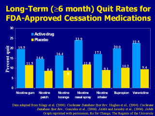 (Hajek et al., 1999). This bar chart summarizes the long-term (≥6-month) quit rates observed with the different NRT products, bupropion SR and varenicline (Gonzales et al., 2006; Hughes et al., 2004; Jorenby et al., 2006; Silagy et al., 2004). These data derive from 124 different placebo-controlled trials; therefore, it is inappropriate to compare the active medications with respect to clinical efficacy. What this chart does illustrate, however, is that the quit rates from each of the methods is approximately twice that of its corresponding placebo control treatment arm. Each of the pharmacotherapy options depicted in the chart is considered effective. When patients ask for assistance with their quit attempt, any product can be recommended, if not contraindicated. However, when assisting patients in choosing a product, clinicians should consider additional factors. The number of cigarettes smoked per day (or time to first cigarette, for the nicotine lozenge), level of dependence, advantages and disadvantages of each product, methods used for prior quit attempts and reasons for relapse, and the patient’s own product preference need to be considered. Behavioral counseling should be used in conjunction with all pharmacologic therapies. Gonzales D, Rennard SI, Nides M, et al. (2006). Varenicline, an ?4ß2 nicotinic acetylcholine receptor partial agonist, vs sustained-release bupropion and placebo for smoking cessation: a randomized controlled trial. JAMA 296:47-55. Hajek P, West R, Foulds J, Nilsson F, Burrows S, Meadow A. (1999). Randomized comparative trial of nicotine polacrilex, a transdermal patch, nasal spray, and an inhaler. Arch Intern Med 159:2033–2038. Hughes JR, Stead LF, Lancaster. (2004). Antidepressants for smoking cessation. Cochrane Database Syst Rev 4:CD000031. Jorenby DE, Hays JT, Rigotti NA, et al. (2006). Efficacy of varenicline, an α4ß2 nicotinic acetylcholine receptor partial agonist, vs placebo or sustained-release bupropion for smoking cessation: a randomized controlled trial. JAMA 296:56-63. Silagy C, Lancaster T, Stead L, Mant D, Fowler G. (2004). Nicotine replacement therapy for smoking cessation. Cochrane Database Syst Rev 3:CD000146. Data adapted from Silagy et al. (2004). Cochrane Database Syst Rev; Hughes et al., (2004). Cochrane Database Syst Rev.; Gonzales et al., (2006). JAMA and Jorenby et al., (2006). JAMA Data adapted from Silagy et al. (2004). Cochrane Database Syst Rev;