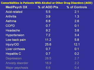 In a west coast health plan, Jennifer Mertens and Connie Weisner and colleagues found that patients with alcohol or other drug problems (AOD) receiving substance abuse treatment (as shown in the first column of numbers) were significantly more likely than those without substance abuse disorders, the controls in the column on the far right, to have each of these conditions listed on the left, again including some very common medical and psychiatric conditions such as low back pain, depression, asthma and arthritis.