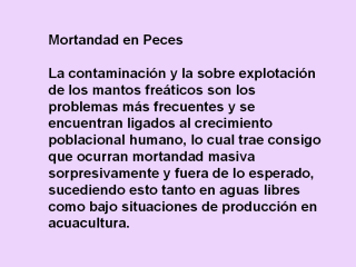 algunas preguntas típicas son: . Dónde y cuándo fue descubierta la mortandad? . Cuál es el tamaño y profundidad del estanque? . Cuál es el origen del agua? . Qué temperatura tiene el agua? . Qué tipo y cantidad existe de vegetación acuática? . Se conocen aplicaciones agrícolas recientes o riego de estiércol líquido animal? . Se han presentado tormentas eléctricas o clima cálido y nublado recientemente? . Fue sólo una especie de pez en la mortandad? . Qué otras especies están presentes en el estanque? . De qué talla son los peces muertos? . Son peces de ambas, talla grande y pequeña en los muertos? . Qué por ciento es el conteo aproximado del número de muertos? . Dónde se encontraron los peces muertos: en la superficie, en el fondo, en las orillas, en el centro o agrupados? . Aún se están muriendo los peces? . Se les encuentra boqueando en la superficie? . Muestran nado errático o comportamiento anormal? . Presentan heridas abiertas, hemorragias, crecimientos o tumores visibles? . Los peces muertos se les encuentran en el ingreso del agua o cerca a la salida hacia el drenaje? |