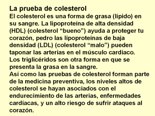 riesgos a la salud, los resultados se agrupan en tres categorías de riesgo. · Deseable: Un colesterol inferior a 200 mg/dL (5.18 mmol/L) es considerado deseable y refleja un nivel bajo de riesgo de enfermedad cardiovascular. · Limítrofe en riesgo: U[n nivel de colesterol de 200-240 mg/dL (5.18-6.22 mmol/L) es considerado como de riesgo moderado. · Riesgo alto: Lecturas de colesterol superior a 240 mg/dL (6.22 mmol/L) es tomado como de alto riesgo. Su doctor pueda solicitar un perfil de lípidos (asi como otras pruebas complementarias) para determinar las causas de el nivel elevado de colesterol. Una vez que se conozcan las causas que lo originan, se podrá especificar el tratamiento apropiado. Tenga en cuenta que el colesterol es elevado durante la preñez. Las embarazadas deberán esperar al menos seis semanas después del nacimiento del bebé para realizar mediciones de colesterol. Medicamentos que se conocen que incrementan el colesterol incluyen esteroides anabólicos, beta bloqueadores, epinefrina, anticonceptivos orales, y la vitamina D. |